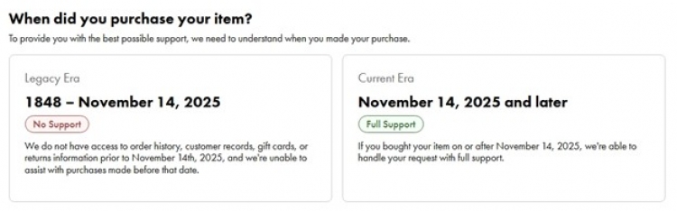Fast forward to last week when I contacted a famous 178-year-old catalog company. They had always boasted of offering a lifetime warranty for their products. Over the years I had become a loyal customer knowing that I was paying more but was willing to do so for the lifetime guarantee. After contacting them asking where I could try to find a transformer for my blown Christmas tree lighting, their response was that the new company only purchased the brand name. They didn't purchase the operations, warranties, or anything else - just the name and the customer list. Below is a picture clipped from their website earlier today. If you purchased a product from them from 1848 to November 14th, 2025, and you need support or warranty information you're out of luck.